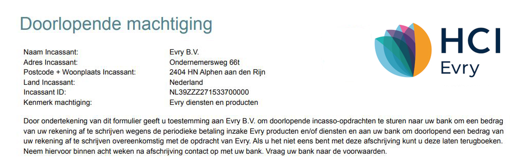 Hieronder kunt u een incassomachtiging afgeven. We incasseren dan uw facturen automatisch. U heeft het recht afgeschreven bedragen tot acht weken na afschrijving door uw bank terug te laten storten.